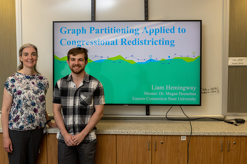 Hemingway won the spring 2023 Council on Undergraduate Research Mathematical, Computing and Statistical Division student award at the recent National Conference on Undergraduate Research (NCUR) at the University of Wisconsin-Eau Claire. His research, presented there and at Eastern’s CREATE conference and at a Northeastern Mathematical Association of America meeting in New Hampshire, used graph theory to create fair congressional districts.