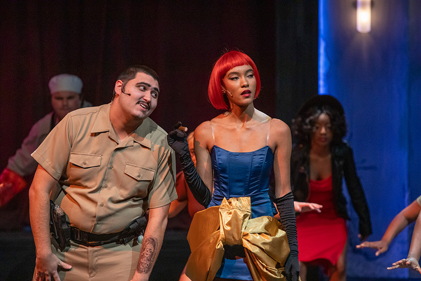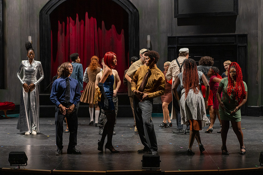 A central theme is the discordant relationship dynamics between humans, one example being the infidelity of an arrogant soldier (Adam Rodowicz ‘26) much to the dismay of his long-suffering wife (Jasmin Lee Clark ‘24), an unlucky teacher whose family life is crumbling (Wesley Silva ‘24) and a silver-tongued lover (Brandon Young ‘25). The soldier’s mistress (Karynn Hardy ‘25) is a washed-up singer whose intoxicated melodies were accompanied by a live band on stage.