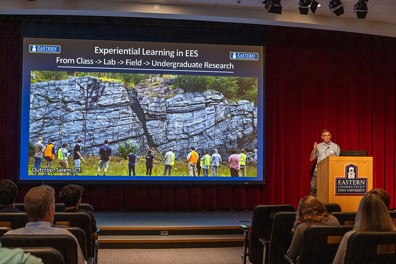 Professor Drew Hyatt highlighted the many ways students engage with EES research. They are able to work at local sites and outside the classroom on campus, using tools and building new techniques, all allowing them to learn through their experiences.
