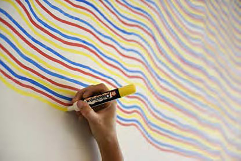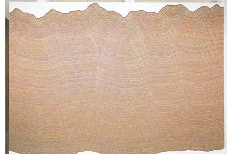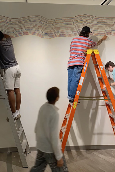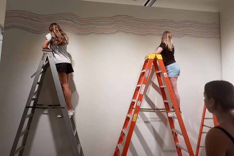 Henry, a junior majoring in philosophy with an art minor, is a gallery assistant at the Art Gallery. She found examples of #797 at places as varied as Greenwich Academy and the Max Planck Institute in Germany. Where LeWitt specified the type of archival markers to be used in executing his drawing, the Greenwich students used what looked like highlighters, Henry said. The Max Planck’s drawing, her favorite, “started with a line that looks similar to a wavelength,” she wrote. The spacing between the lines gave a “thin, mesh-like effect.”