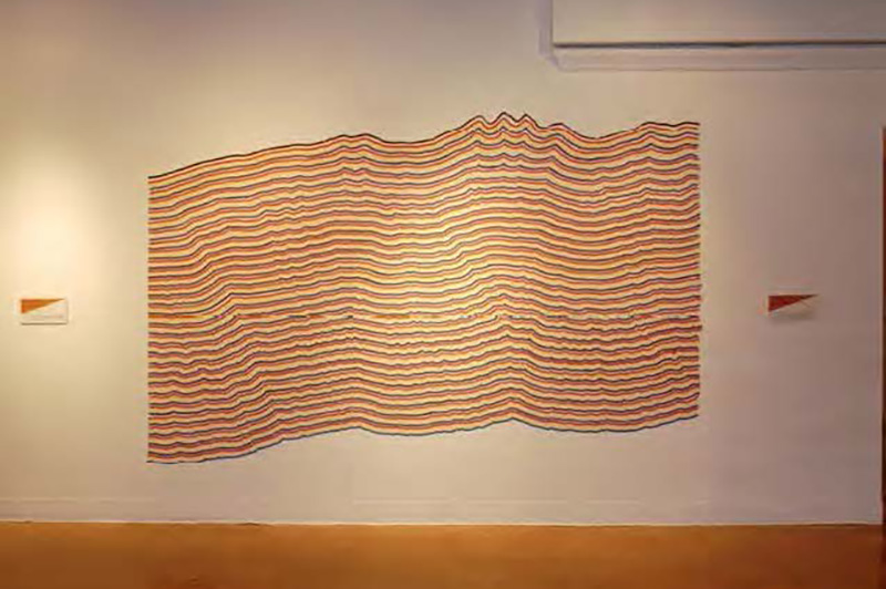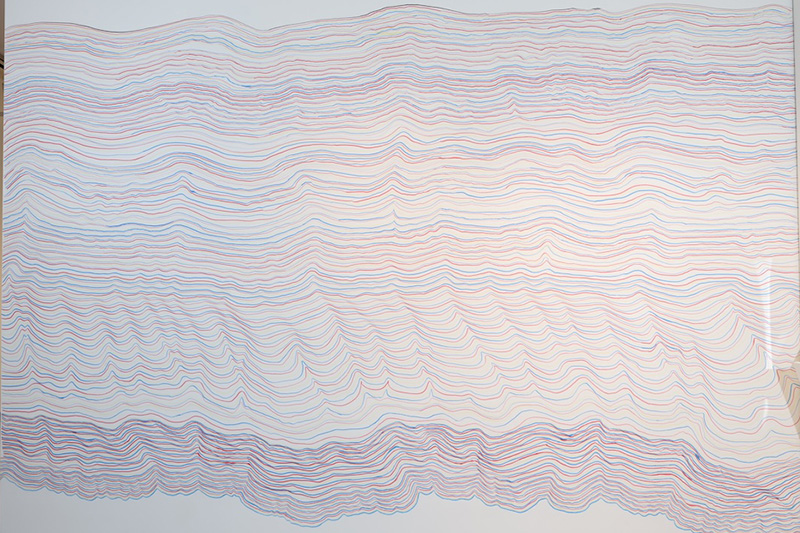 LeWitt, a pioneer of the minimalist and conceptual art movements, provided directions for his drawings to be executed by others. Drawing #797’s instructions say to start with a black horizontal line near the top of the wall, and each line under that, in red, yellow or blue marker, mimics the first, until the bottom of the wall is reached.