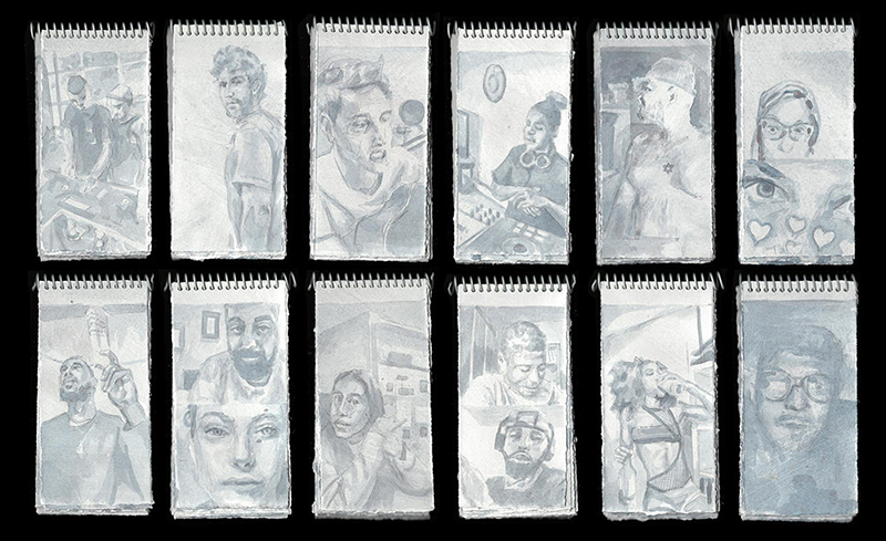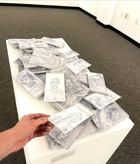 An interactive element in Michael’s show is “Live,” a series of illustrated portraits bound in small notebooks. Each person who serves as a subject is said to be going about their work until being on camera. According to Michael, most of the subjects were taken from livestreams on social media platforms such as TikTok and Instagram. Those who attend the gallery are permitted to flip through the notebooks, which is reminiscent of scrolling through social media.
