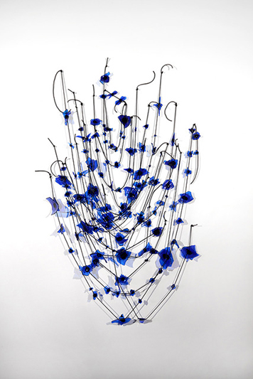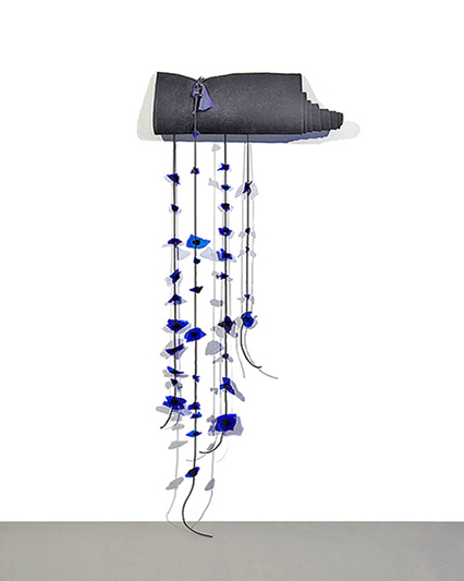 June Ahrens has four emblematic pieces featured in the gallery, with each piece constructed out of fragmented blue glass along with found materials such as barbed wire and felt. According to her, her work frequently addresses issues of “fragility, vulnerability, danger and healing,” which she related to Circe’s story.