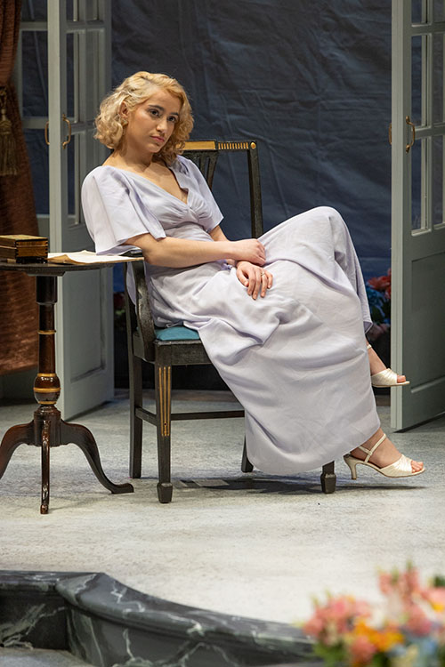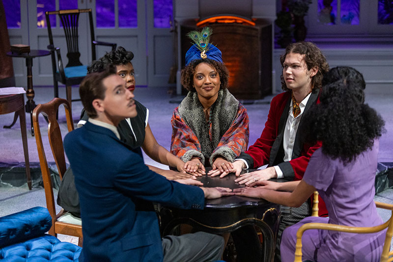The Condomine’s lives are turned upside down one night when entertaining their pragmatic friend Dr. Bradman (Kane Waggoner ‘24) and his sassy wife Violet (Xsyanni Jackson ‘25), who take part in a seance conducted by Madame Arcati to communicate with Daphne, the house’s late former tenant (Jenaesia Jones ‘27). Playing on the gramophone is Irving Berlin’s 1925 hit “Always,” Elvira’s favorite song.