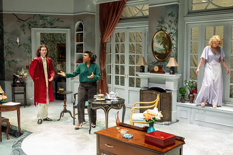 In the play, Charles is torn between his late wife and his living wife. Elvira secretly sabotages the Condomines’ automobile in a desperate attempt to kill Charles and keep him for herself. Ruth accidentally falls into the trap and is killed. Twice bereaved and twice as frenetic, Charles and Madame Arcati collaborate to exorcise the angry ghosts of both his wives. Their attempts are in vain until high-strung housekeeper Edith (Emma Yacono ‘26) uses her newly discovered clairvoyance to send Ruth and Elvira back to the other side.