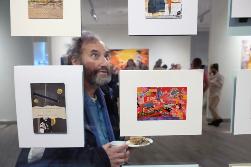 Each of the pieces making up the collage have been sent in by members of the NCS from across the United States and around the world. They take the size and shape of a standard postcard. Artists have the freedom to layer different materials, draw, paint and reimagine the four- by six-inch postcards.