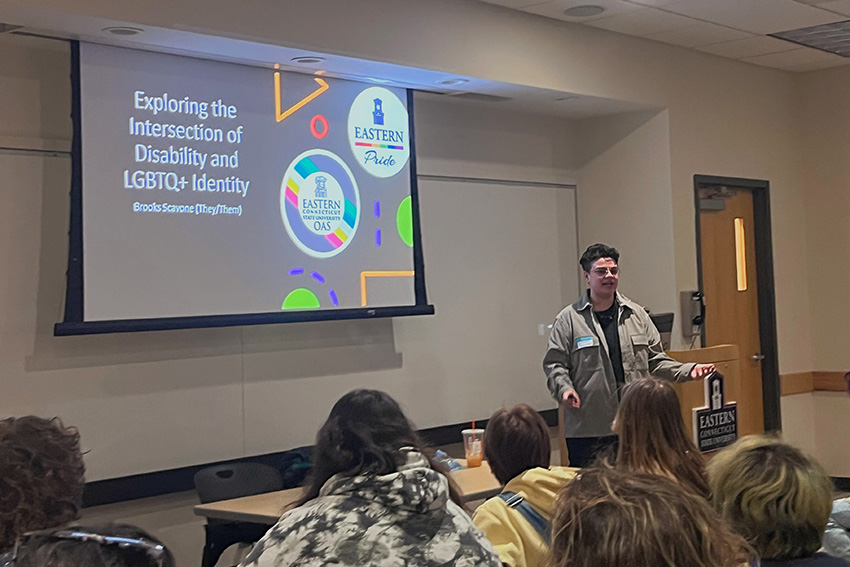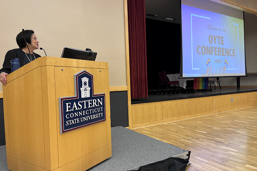 LGBTQ-identifying high school students across the state gathered at Eastern Connecticut State University to learn about the University’s resources for LGBTQ students, hear from current students and attend workshops on intersectionality. The “Queer Youth To Eastern” conference was organized by Arden Parzych ’25, a student ambassador for Eastern’s Pride Center, to give LGBTQ high schoolers the chance to see “a world outside of their hometowns.”