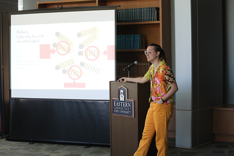 The students heard presentations from three Eastern students, Pearl Kwadzi ’26, Billi Kozak ’24 and John O’Connell ’24, on their own biology research. Professor Barbara Murdoch, biology department head, spoke to them about the genesis of Tiny Earth program. Murdoch was mentored at Yale University by the Tiny Earth founder, Jo Handelsman, who now directs the institute at the University of Wisconsin where Tiny Earth is based.