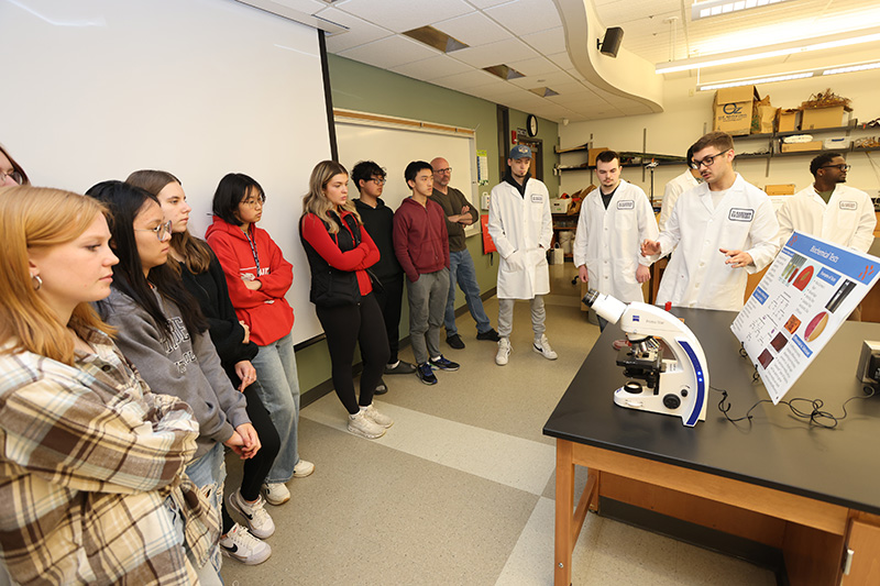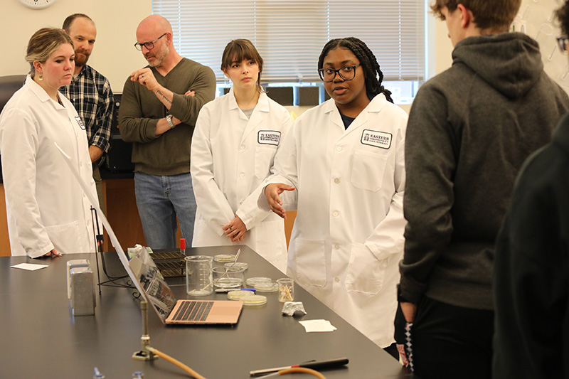The high school students also got a primer on lab safety. They visited five lab stations overseen by Eastern biology students, where they learned techniques such as culturing microbes from the soil, testing for safe prospects for antibiotic production and gene sequencing. They also had hands-on experience with simple procedures, Hulvey said.