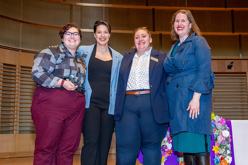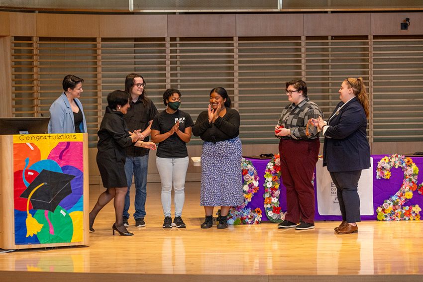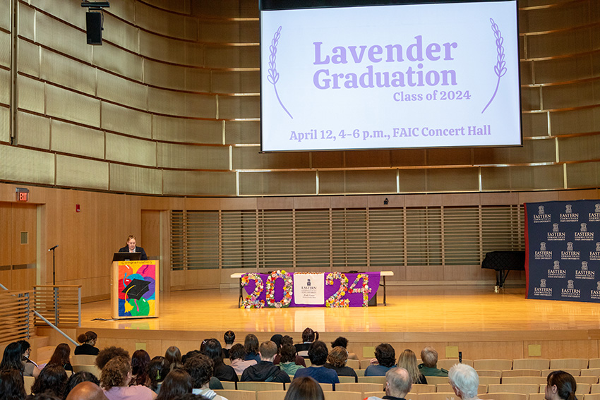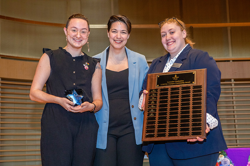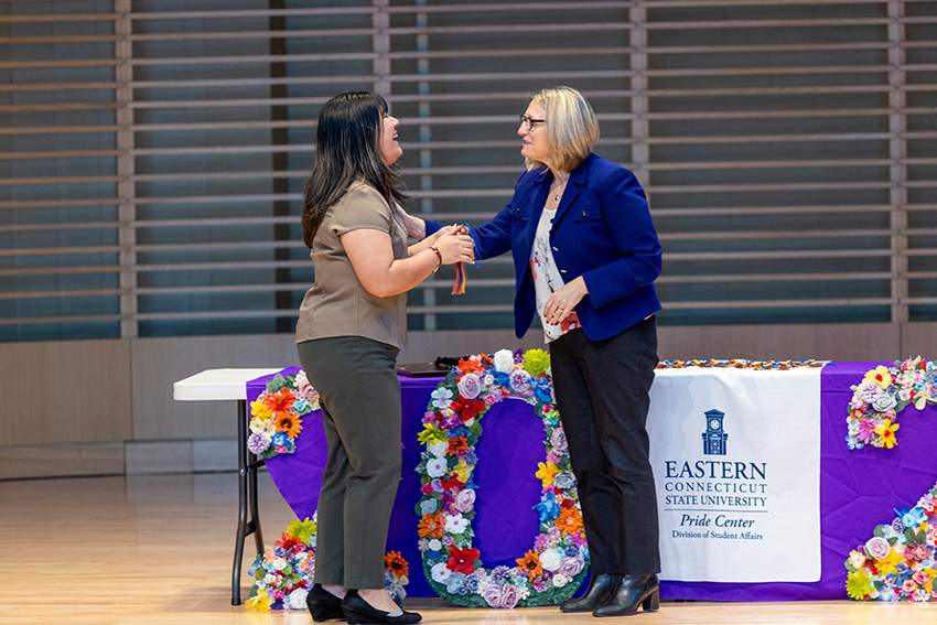With the largest graduating cohort ever of queer students, the Pride Center at Eastern Connecticut State University recently hosted its seventh Lavender Graduation. President Elsa Núñez and awardees Billi Kozak and Arden Parzych were honored during the ceremony.