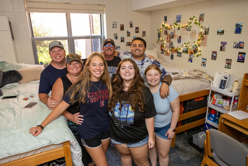 “It was a beautiful day to be an Eastern student,” said Vice President for Student Affairs Michelle Delaney of move-in day. “We were thrilled to welcome more than 700 first-year students and their families to their new home away from home. The day started with returning students helping to move bags, bins and refrigerators into rooms, included a class picture and ended with a Rock the Roof party on the top of the parking garage.”
