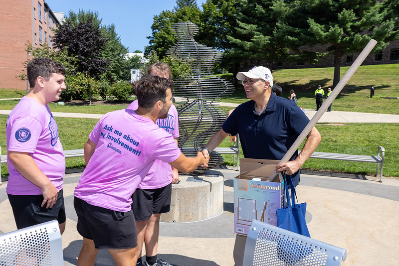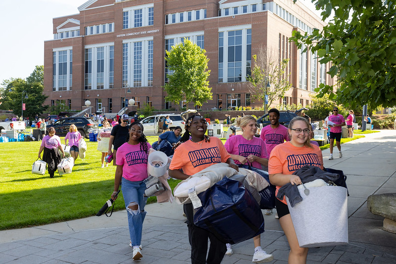Along with staff from the Office of Housing and Residential Life, move-in day was facilitated by student volunteers from the women’s volleyball team, Center for Community Engagement, Academic Success Center and other organizations. Eastern President Karim Ismaili and Terrence Cheng, chancellor of the Connecticut State Colleges and Universities, also made an appearance, mingling with students and families.