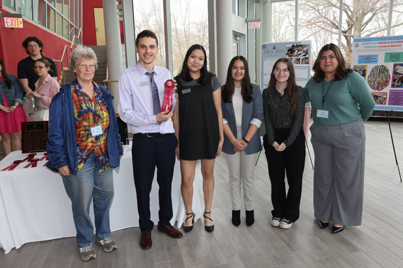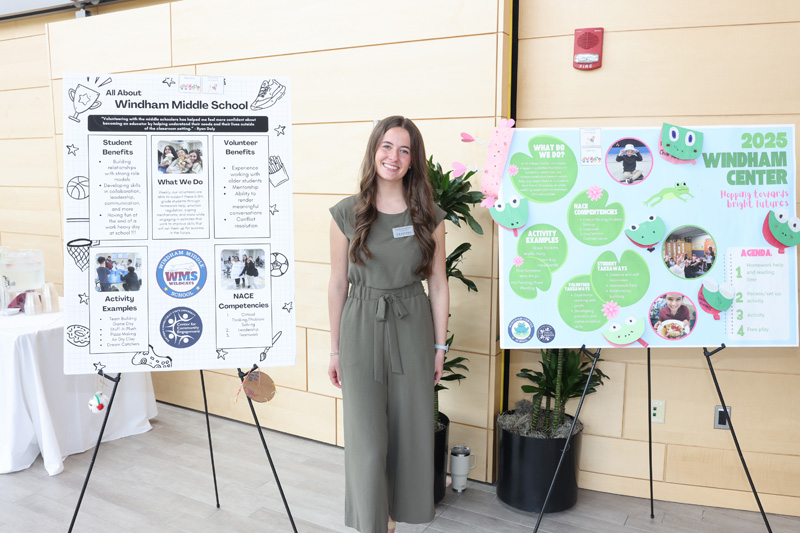 CCE student leaders and volunteers presented their work on posters, with attendees and judges milling about the room and stopping to ask presenters about their work. Each project involved students aiding organizations in and around Windham.