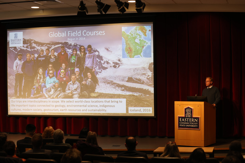 Environmental earth science Professor Dickson Cunningham started the flash talks with a presentation titled “50 Years of Environmental Earth Science Scholarship at Eastern, from Local to Global Impacts."