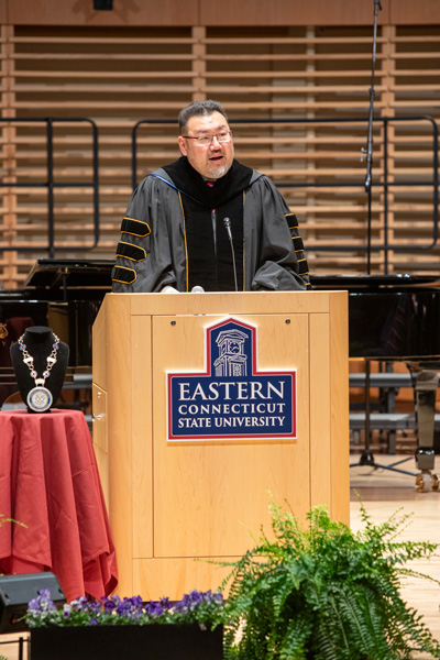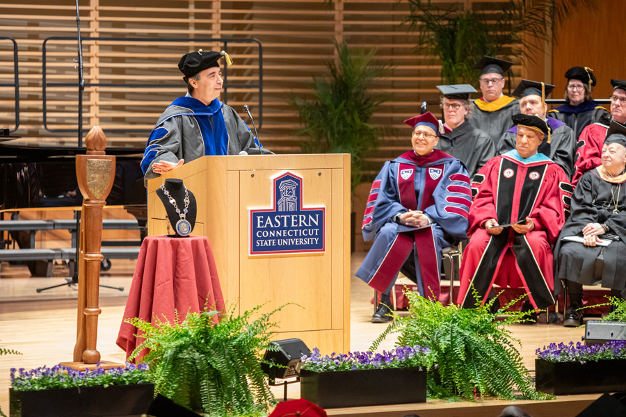 He reflected on the significance of moments like university inaugurations, which connect institutions to the trailblazing developments that precede them — such as the founding of the Willimantic State Normal School in 1889, the institution from which Eastern emerged.