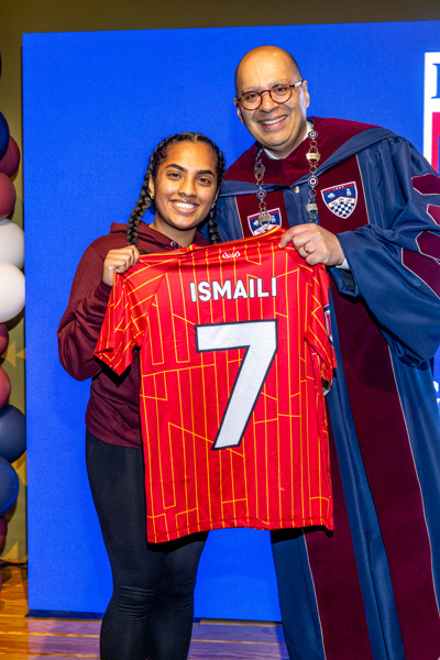 The ceremony also featured musical performances by Professor Emily Riggs and the Eastern Concert Chorale, conducted by Professor David Belles with piano accompaniment by Eric Ouellette. Among the chorale's performances was a surprise rendition of "You'll Never Walk Alone," the anthem of the Liverpool Football Club — Ismaili's favorite team.
