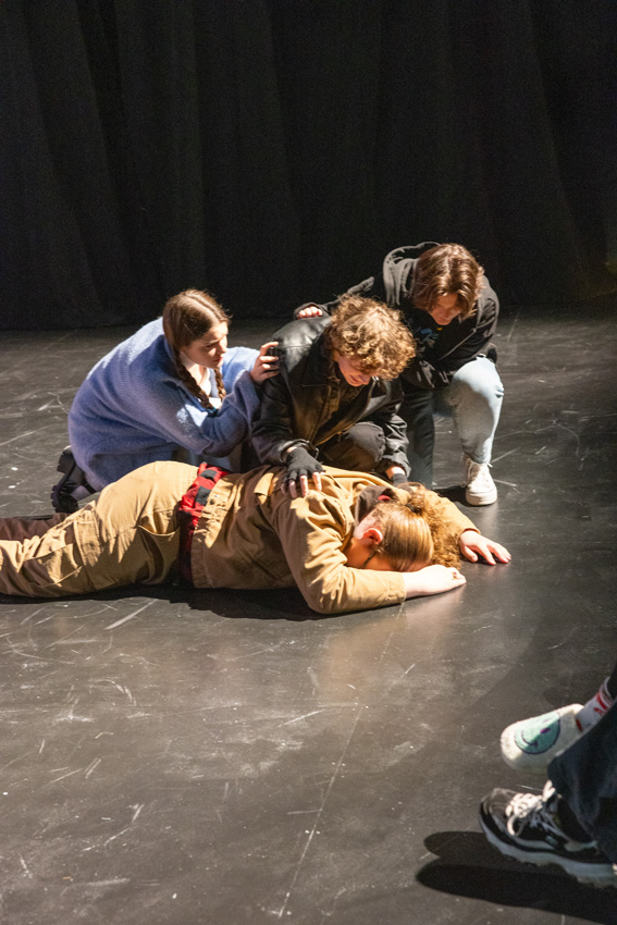 The spirits that accompany Swiftrunner, a crow (Bonnie Mentz ‘26), a quail (Shannon Carbonell ‘27), a caribou, and a rabbit, guide the audience through the duration of the play, feeding off the characters’ energy and interpersonal strife.