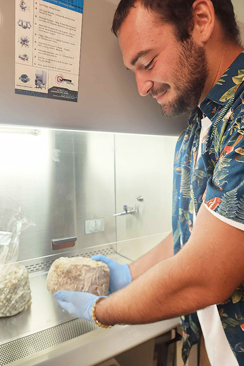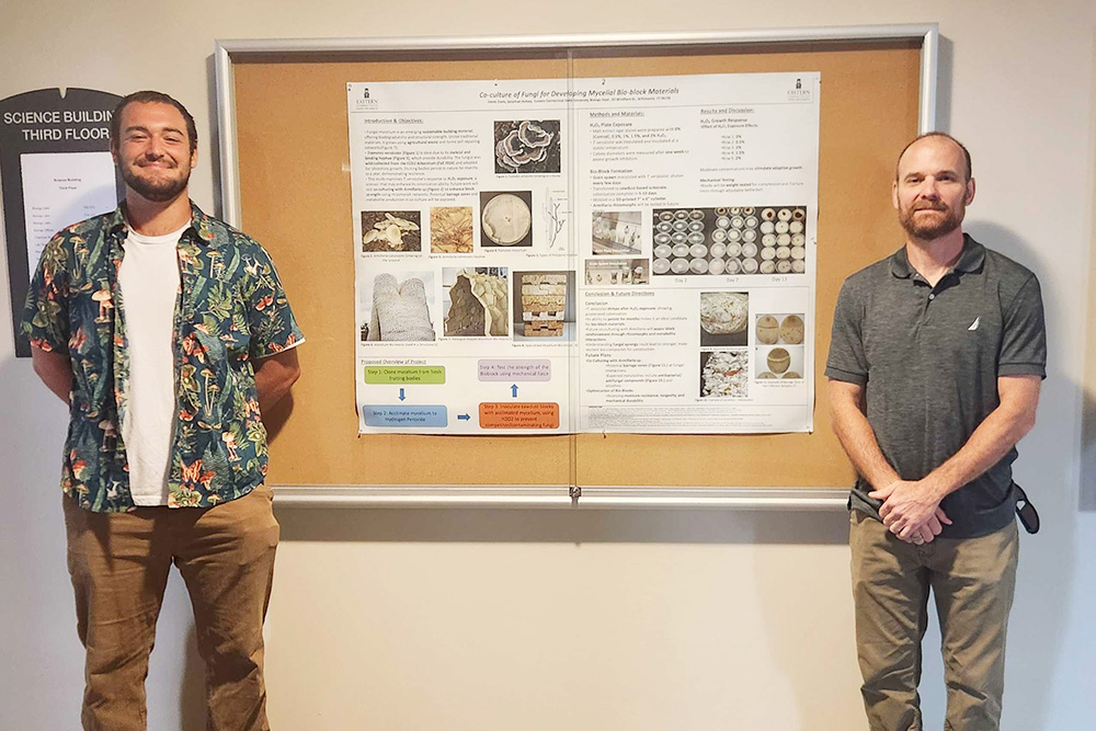 Mycelial bio-blocks are building materials grown with root strands of fungi. The material is strong, renewable, and biodegradable, and being studied at Eastern Connecticut State University. Senior biology major Derek Davis explored this new technology in an independent study with biology Professor Jonathan Hulvey this past spring.