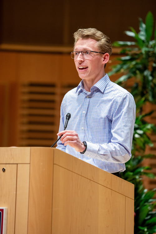 Political science major Zachary Robinson addressed his peers in a speech that reminded them of the significance of Eastern, noting its tightly knit environment, community, students, and the undergraduate opportunities it provides. “I will always continue to carry Eastern with me,” he said.