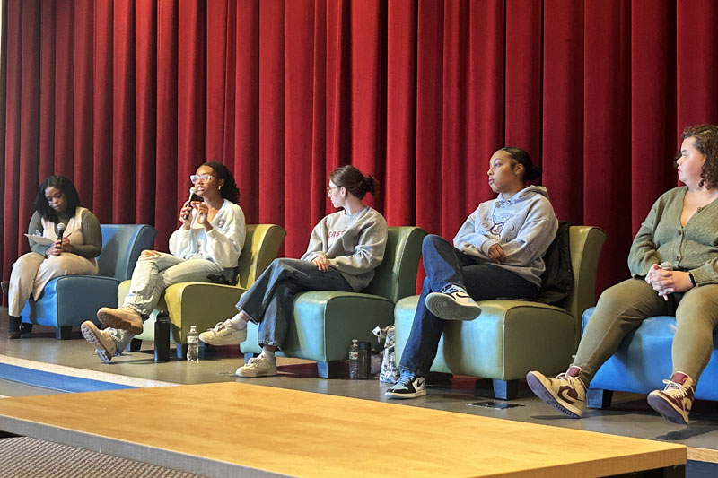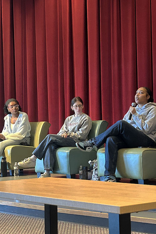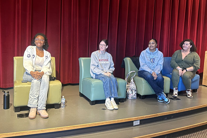 Four student athletes joined Eastern’s Women’s Center on March 10 for a “Women in Sports” panel. Celeste Petrowsky, Emily Jones, Natasha Frisch, and Taylor Smith represented various sports offered at Eastern, including women’s rugby, track and field, swimming, and volleyball.