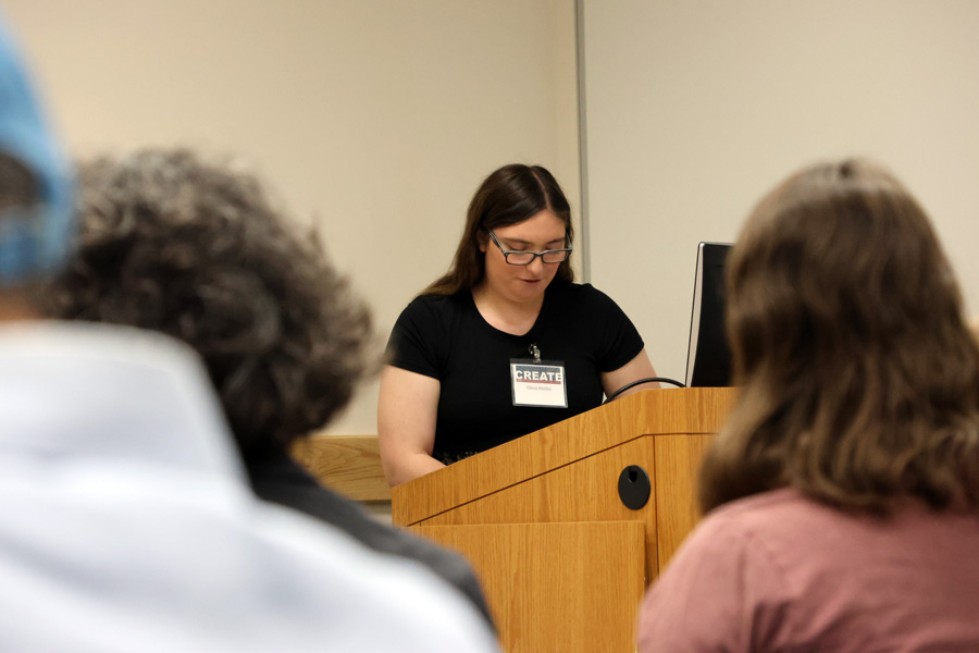 She commented on the diversity of research topics at CREATE and the intermixing of subject matter on panels. “We had a presenter talking about an art exhibit which she curated, a discussion on themes between a musician’s collections of work, how the mind works with dreams, and a group’s ideas on how to help a local business boost their membership.”