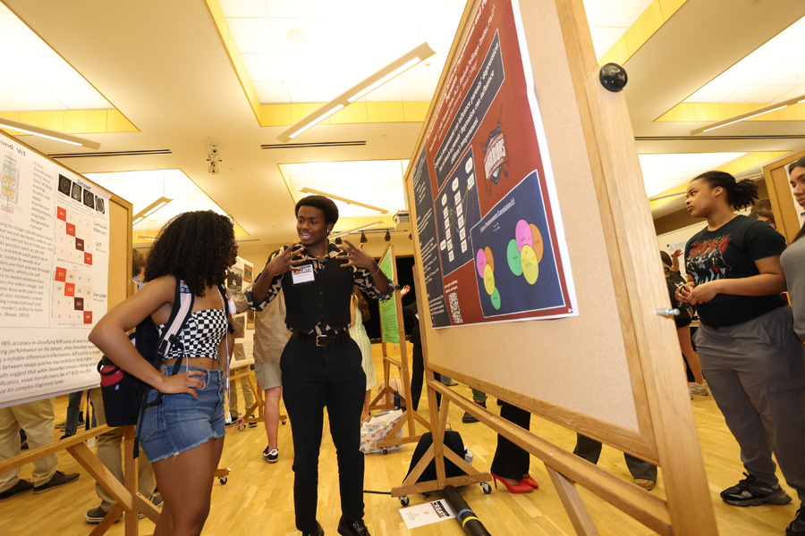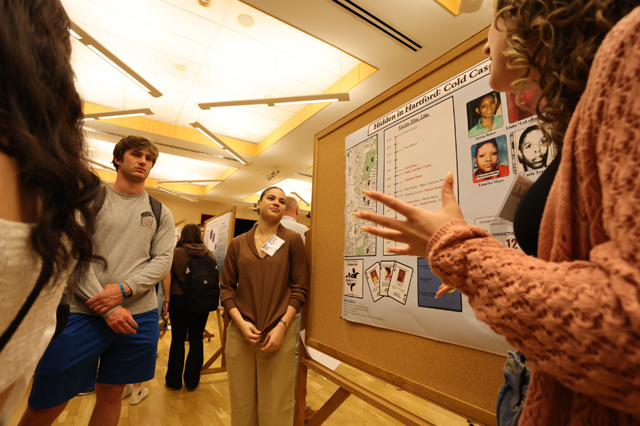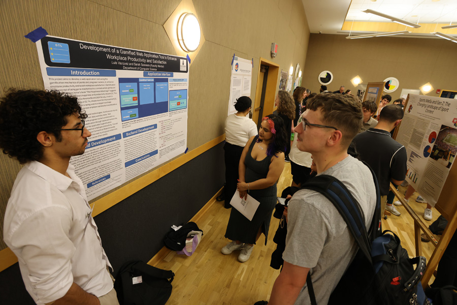 During the lunchtime remarks, President Karim Ismaili commended all of the participants for their groundbreaking research. He personally awarded two of the outstanding presenters: senior history major Emma McCormack for her poster presentation on the cultural impact of McDonald’s in the Soviet Union, and senior music major Aidan Reiss for his talk on the composer Erik Satie’s legacy. Additionally, biology Professor Kurt Lucin and education Professor Sudha Swaminathan were also awarded for their faculty mentorship.
