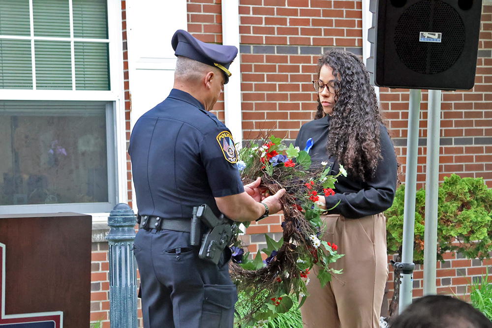 Sara Madera, director of institutional equity and Title IX coordinator, hung this year’s memorial wreath to commemorate the police who have died in the line of duty this year.