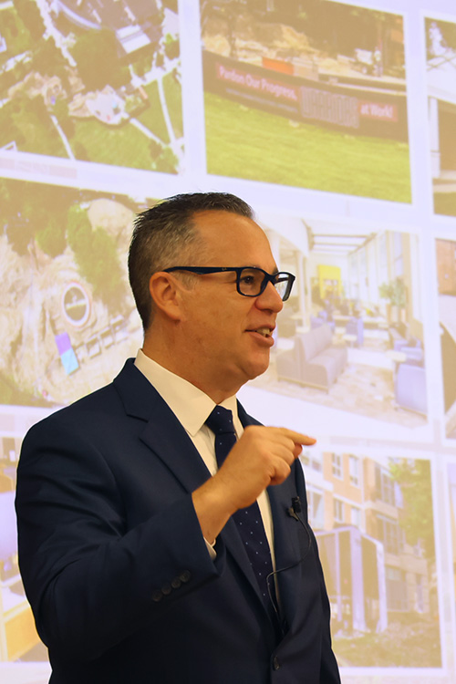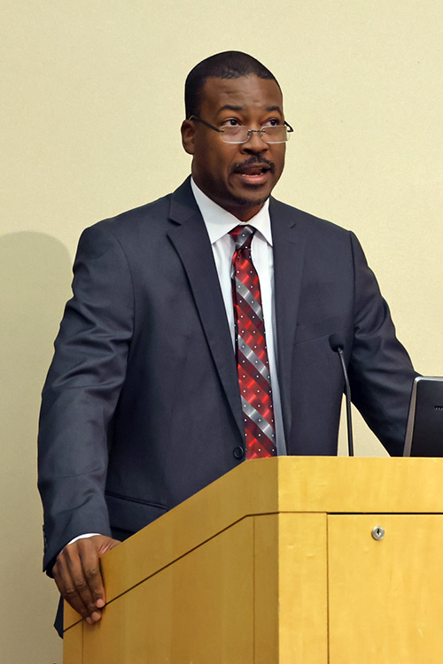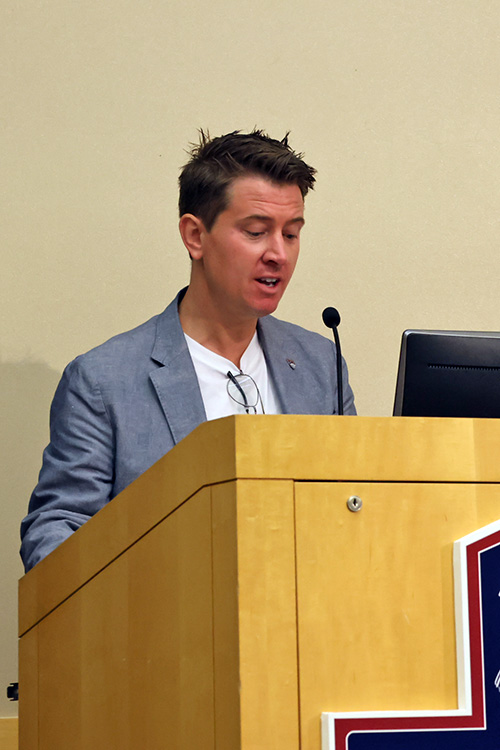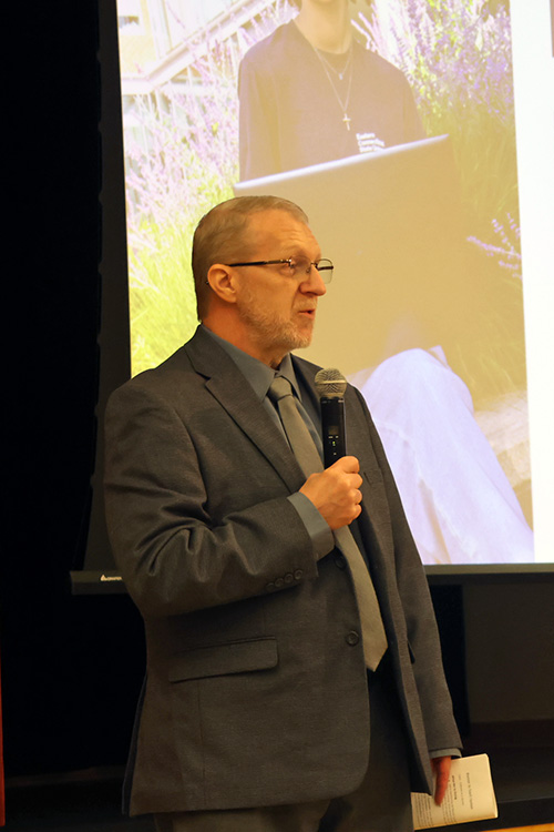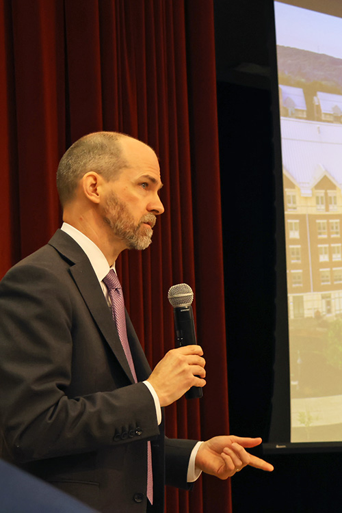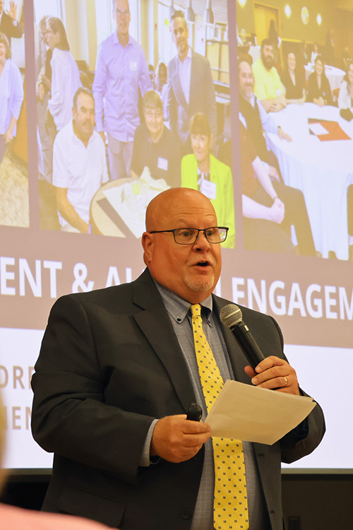 President Karim Ismaili opened with enthusiasm for the year ahead and reflections on a busy summer. From the STEP/CAP program’s 40th year to three week-long summer research institutes, the second annual STEM program for minority students, and the renaming of the baseball field to Holowaty Family Field, Ismaili said it was “a very productive summer for Eastern.” He thanked the community, noting: “All of you, in whatever role you play, make the special stuff at Eastern happen.”