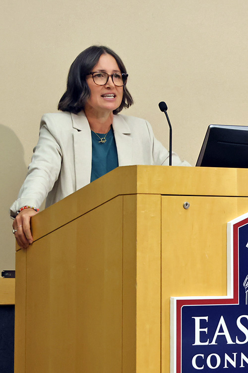 She highlighted Eastern’s participation in the U-Pass transit program and a $10,000 Stop & Shop donation to Shawn’s Cupboard. In athletics, she announced the addition of women’s golf, women’s flag football, and turf upgrades. “We will be one of only 30 Division III institutions nationally fielding a [flag football] team come next fall,” said DeLaney.