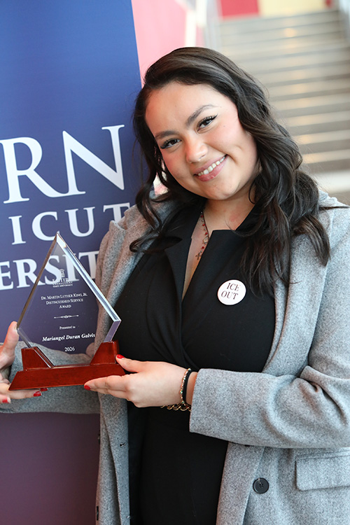 Senior health sciences major Mariangel Duran Galvis was presented with the Dr. Martin Luther King Jr. Award. In her acceptance speech, she remarked that leadership is about service rather than authority.