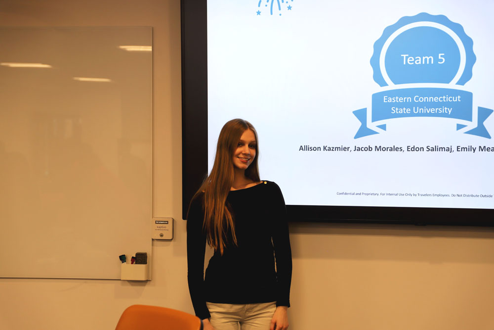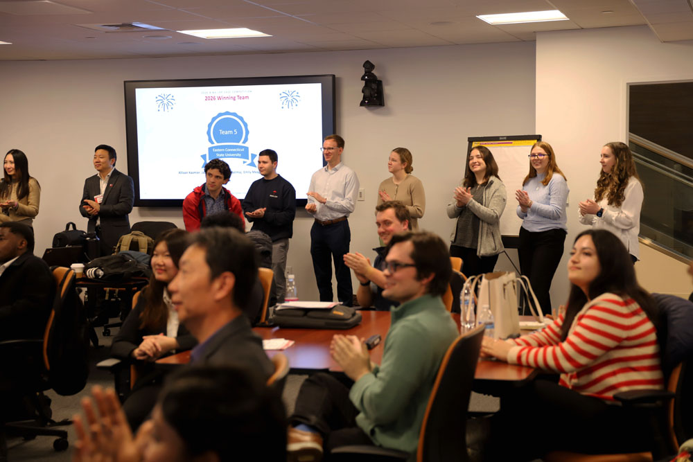 Four undergraduate business information systems (BIS) students outperformed acclaimed business schools at a business analytics case competition on April 3 at Travelers in Hartford. The team earned first place, facing fierce competition from five teams from four other institutions: UConn, Quinnipiac University, the University of Hartford, and Central Connecticut State University.