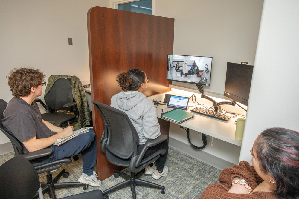During the simulation, a patient and social worker pair off for eight-minute clinical sessions, observed by social work classmates in a separate room who are watching a live recording. Following the session, the patient gives in-character feedback, telling the social worker what made them feel heard or dismissed.