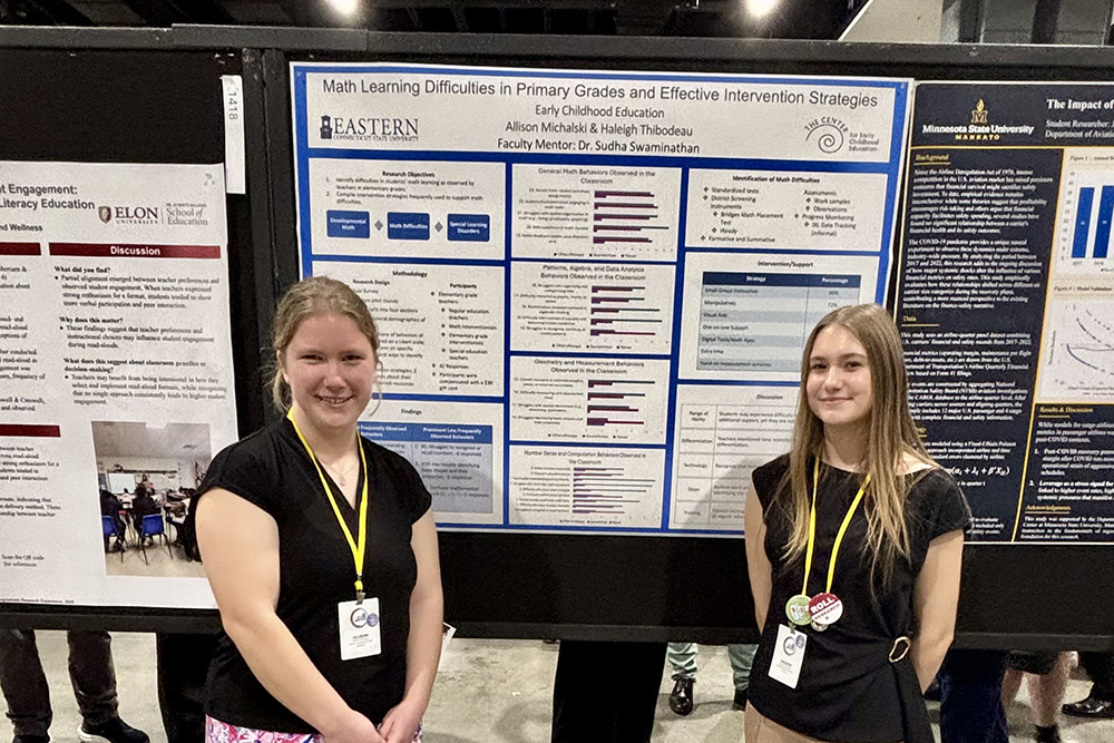 Early childhood education majors Haleigh Thibodeau and Allison Michalski presented on math learning difficulties in primary grades. Additionally, the pair attended presentations by fellow presenters, which allowed them to gain new insights into students' learning patterns.