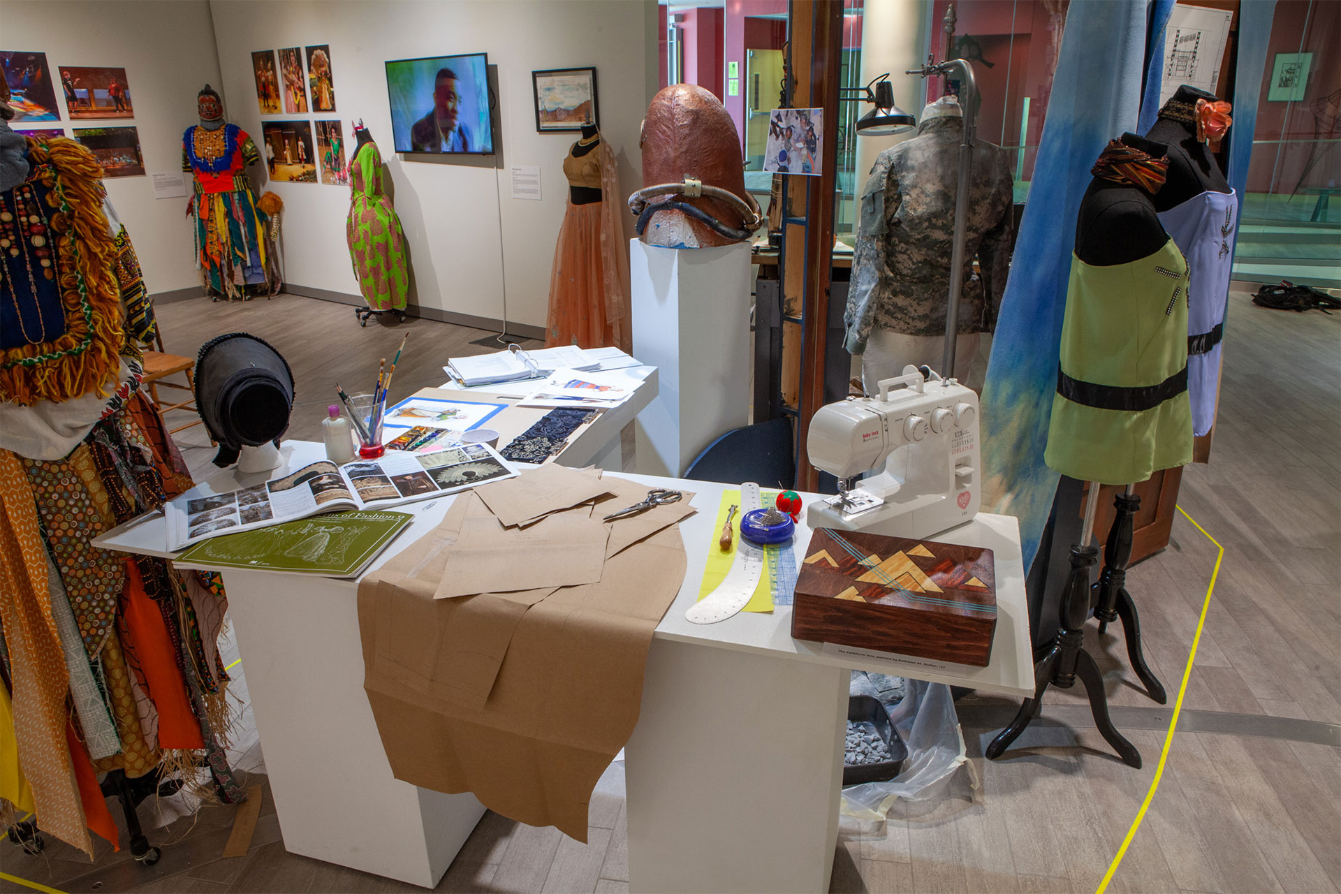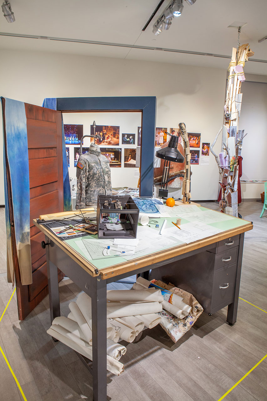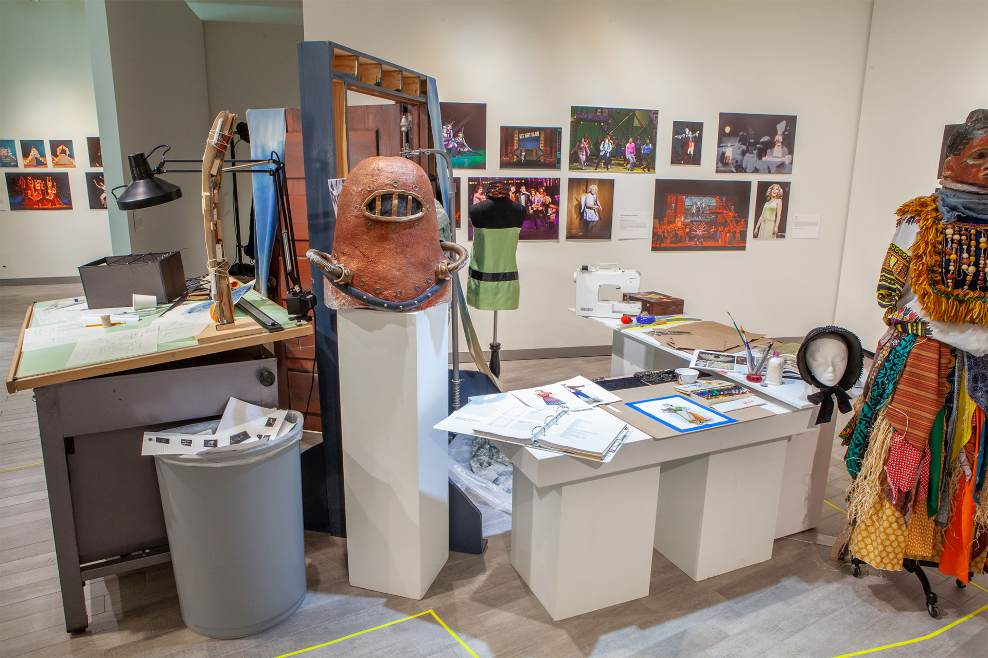I envisioned this exhibition as a celebration of the Theatre Programs’ five years in the FAIC to be shared with students, faculty, alumni, our audiences, and countless others who have been involved with the program in numerous ways. However, the scope became much more ambitious: mainly, offering opportunities to understand our program better; experience behind-the-scenes work by magnifying the “invisible”; and introduce the faculty’s work and how our research and scholarly interests intersect with our shows and contribute to our teaching. Above all, this exhibit highlights the collaborative nature of our work— with each other and our amazingly talented students. It became clear that the best way to do this would be to reveal the unique, imaginative and sometimes intensely personal processes that lead to performance.