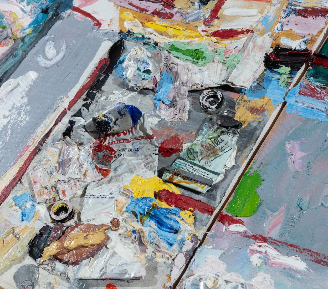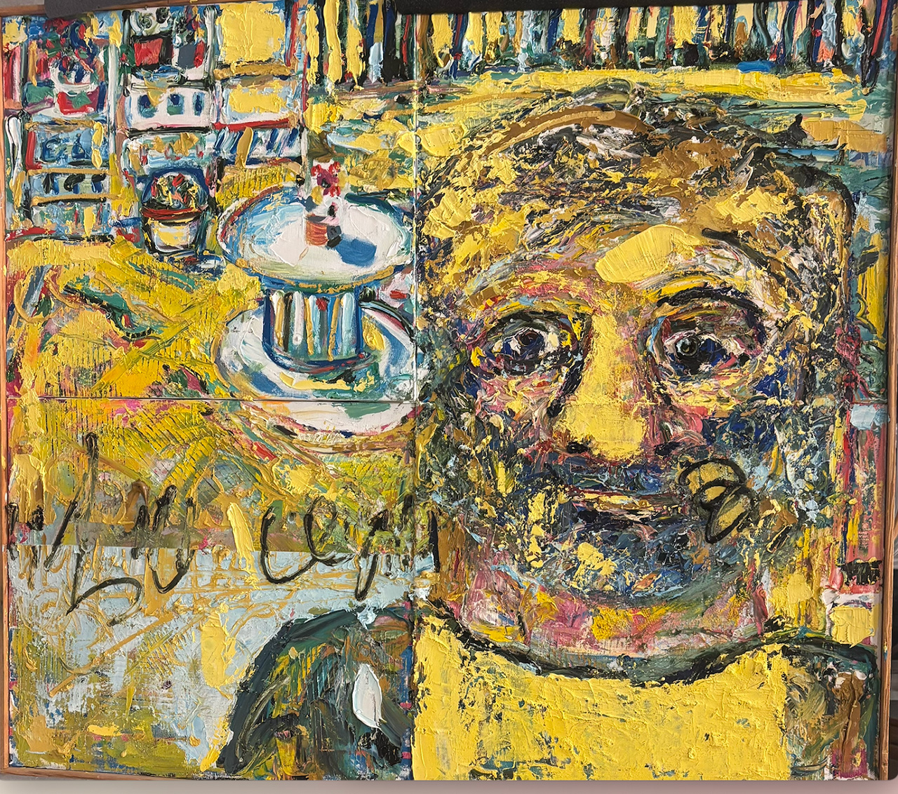 Tom Gargiulo (1934–2023), a Bridgeport native, earned the title of Connecticut Modernist for his bold style, innovative use of color and texture, and deep roots in the state’s artistic tradition. His work is a vibrant fusion of influences. From the Impressionists, he drew lively brushwork and radiant hues that bring his landscapes to life, capturing moments as fleeting as light on water or wind on trees. Influenced by the Post-Impressionists of the 1940s, his introspective self-portraits and studio interiors are charged with personal symbolism and the emotional tension born from his artistic dilemmas. From American conceptual artists of the 60s and 70s, he inherited a spirit of fearless experimentation—using shaped canvases, and “tools of the trade”: tubes of paint, brushes, and palettes fixed to the canvas to push the boundaries of form and meaning.