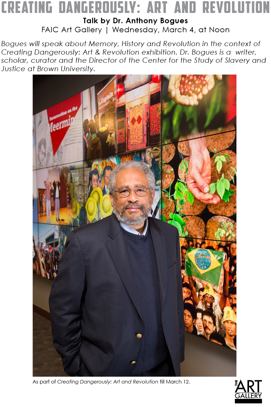 Thursday, February 13th @ 12:30 PM Lewis Gordon, Professor of Philosophy at UCONN. VENUE TBA, reception at the gallery