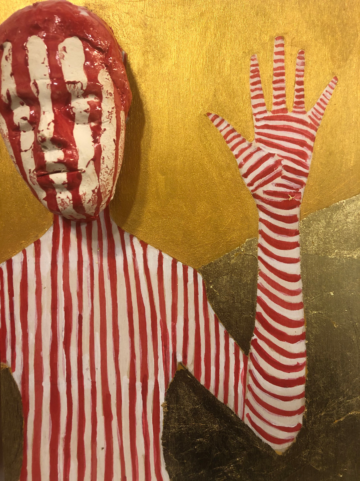 Aisha Tandiwe Bell, drip sweat sweet candy cane strips like blood or prison. 9”x 12” x 3 “ clay, enamel, metal leaf, and acrylic on wood, image courtesy of the artist