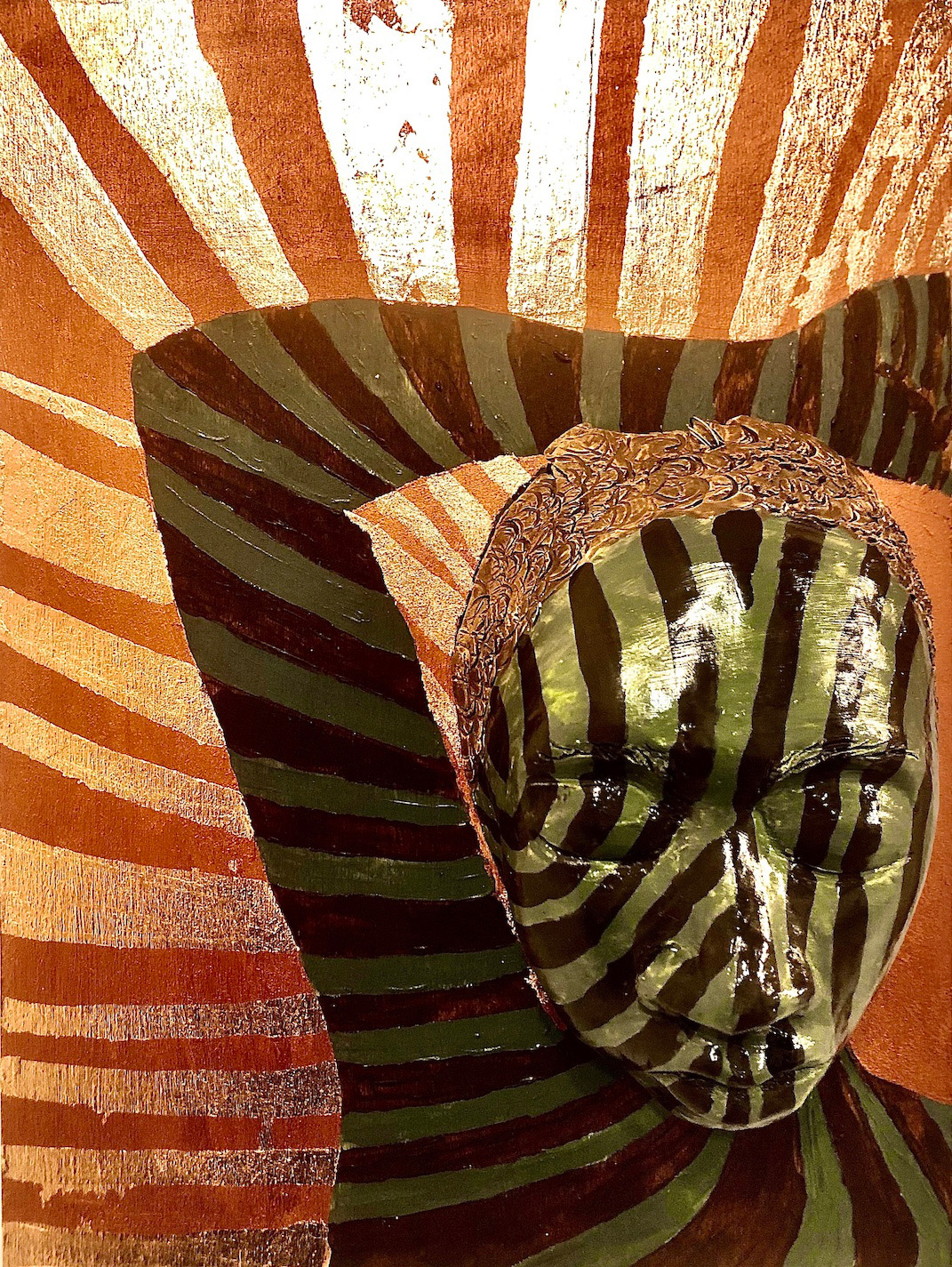 Aisha Tandiwe Bell, My fist have been punching the air so long/ a moment in these rays thought waves” 9”x 12” x 3 “ clay, enamel, metal leaf, and acrylic on wood, image courtesy of the artist