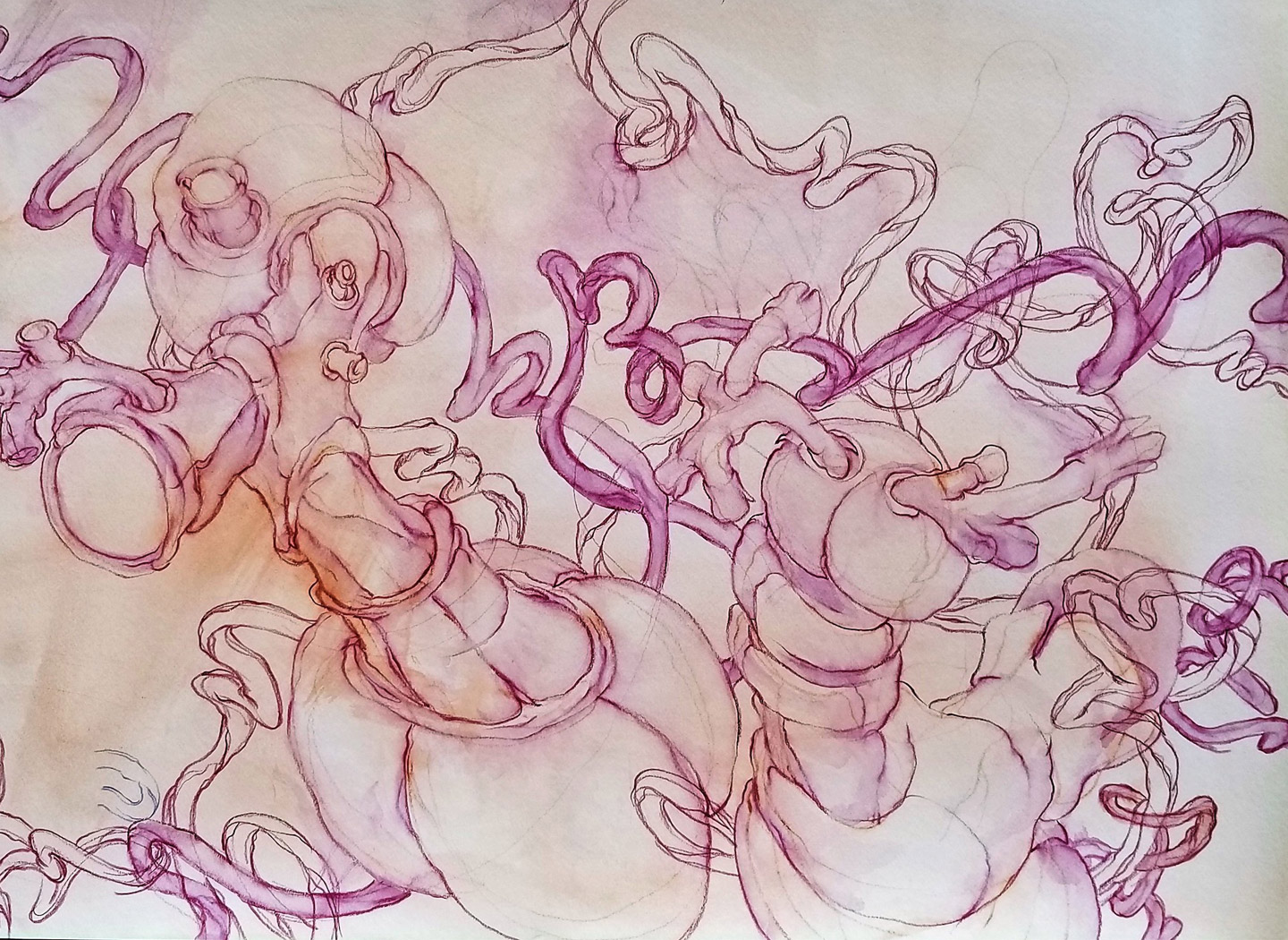 Juanita Lanzo, Brown and Purple Cohabitation, 2018, Watercolor pencil on watercolor paper, 18 x 24 in, images courtesy of the artist