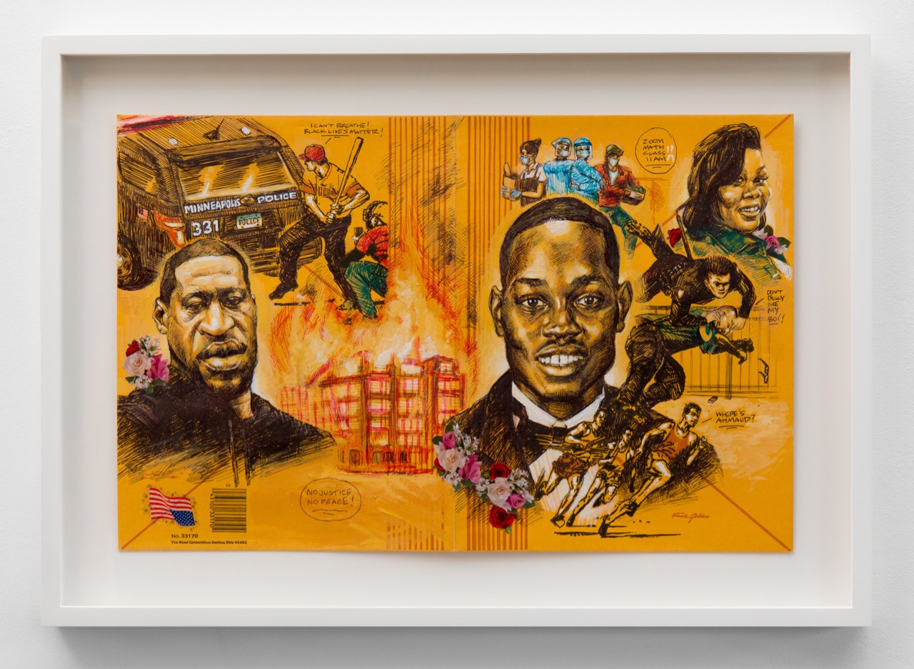 Patrick Martinez, Racism Doesn’t Rest During A Pandemic Pee Chee (No Justice No Peace), 2020, Bic pen, stickers, acrylic, white out on found pee chee folder, 12 x 9.5 inches folded, framed, image courtesy of the artist and Charlie James Gallery