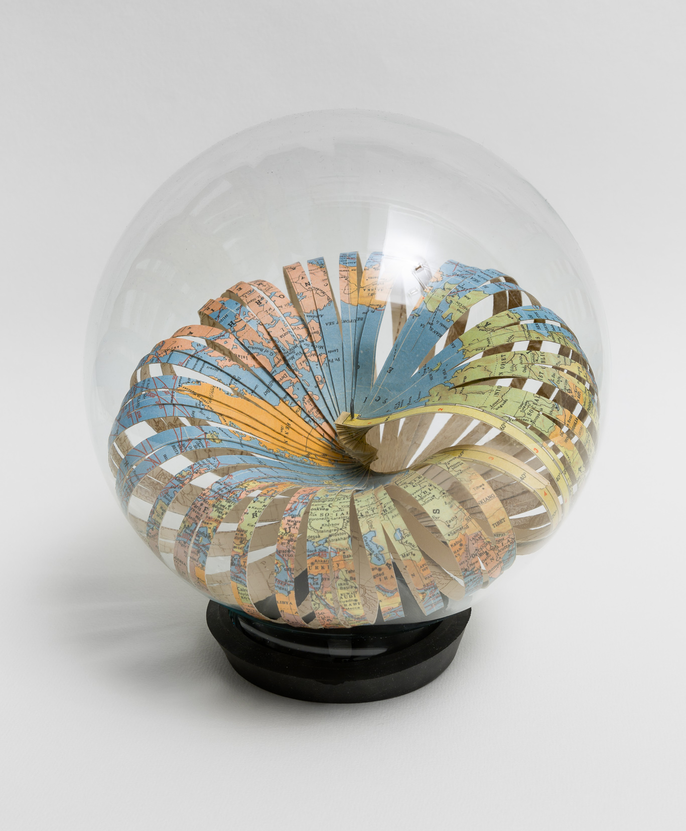 Viviane Rombaldi Seppey, Fragile, 2017, hand cut atlas page (the world), glass dome, wire, plastic base, 8 x 7 in