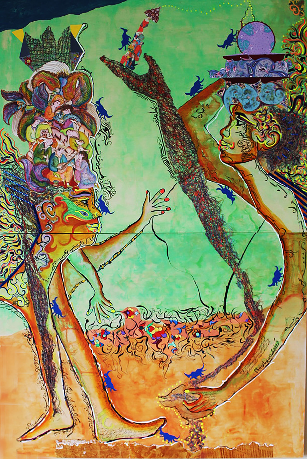 I subvert the classic narrative of Shahnameh which highlights and exploits male characters who dominate the work. I reposition and illuminate the compassionate, brave, loyal, and sensuous women from the periphery to the center of the epic. I highlight the considerable roles these women played in supporting and enabling the successes of the kings and heroic male characters in Shahnameh.