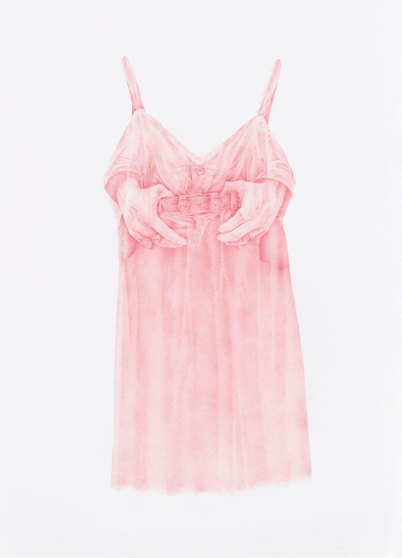 My colored pencil drawings of intimate lingerie explore interconnected narratives of pain and pleasure through images based on photojournalism, art photography, and historical symbolism. I use an aesthetic of pleasure to entice the viewer, who finds, past lace and filigree, disruptive iconography narrating inherited histories of nation and belief.