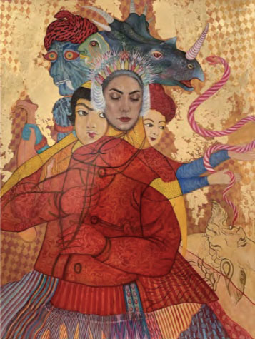 Of the “Crown Series” Sabzevari says, “I think every woman is a queen, which is why in my portraits I depict a crown…My personal story, my experiences in life and my lucid dreams all inform what the crown eventually morphs into.” Drawing from Persian mythology and her love of animals, the crowns can be writhing with colorful, fantastical creatures and deities, as well as figures from Persian literature.