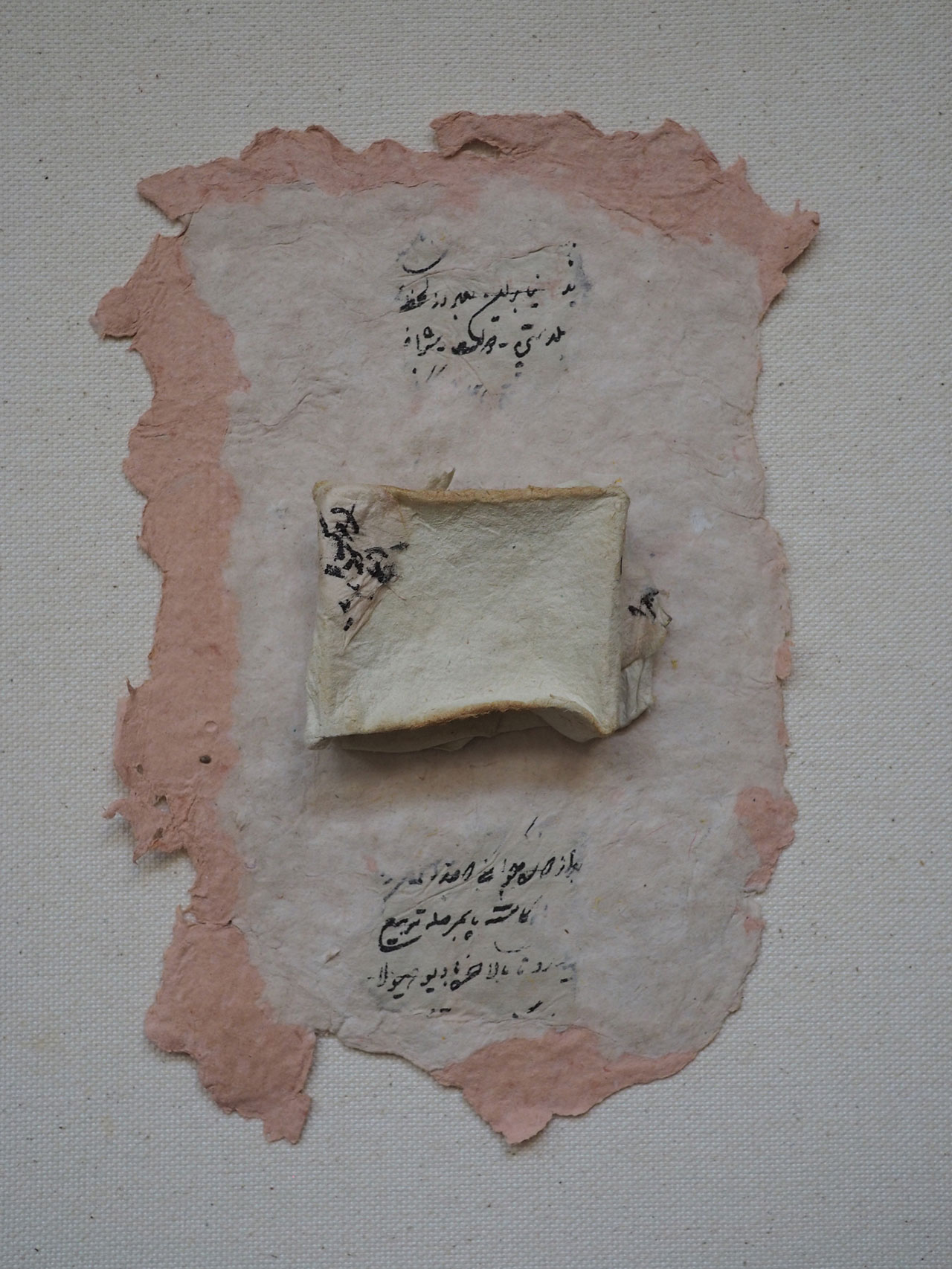 “Intervals” reflects my interest in investigating the sense of space, which is fleeting and veiled, through the exploration of architectonic and linguistic structures. The two primary sources of inspiration in this series are the traditional central courtyard of Persian domestic architecture –as a site of spatial and social interactions–and family epistolary communications–as a means of emotional and social exchange between family members in and far away from home. Central courtyards served as a threshold space in the heart of the private domestic spaces that facilitated public interactions. Epistolary communications, at the same time, were written procedures that transmitted the interiority of the self to the exterior world. In my work, these sources of inspiration meet while I put together fragments of family epistolary communications and shaped dyed pulp paper to create a sense of space.
