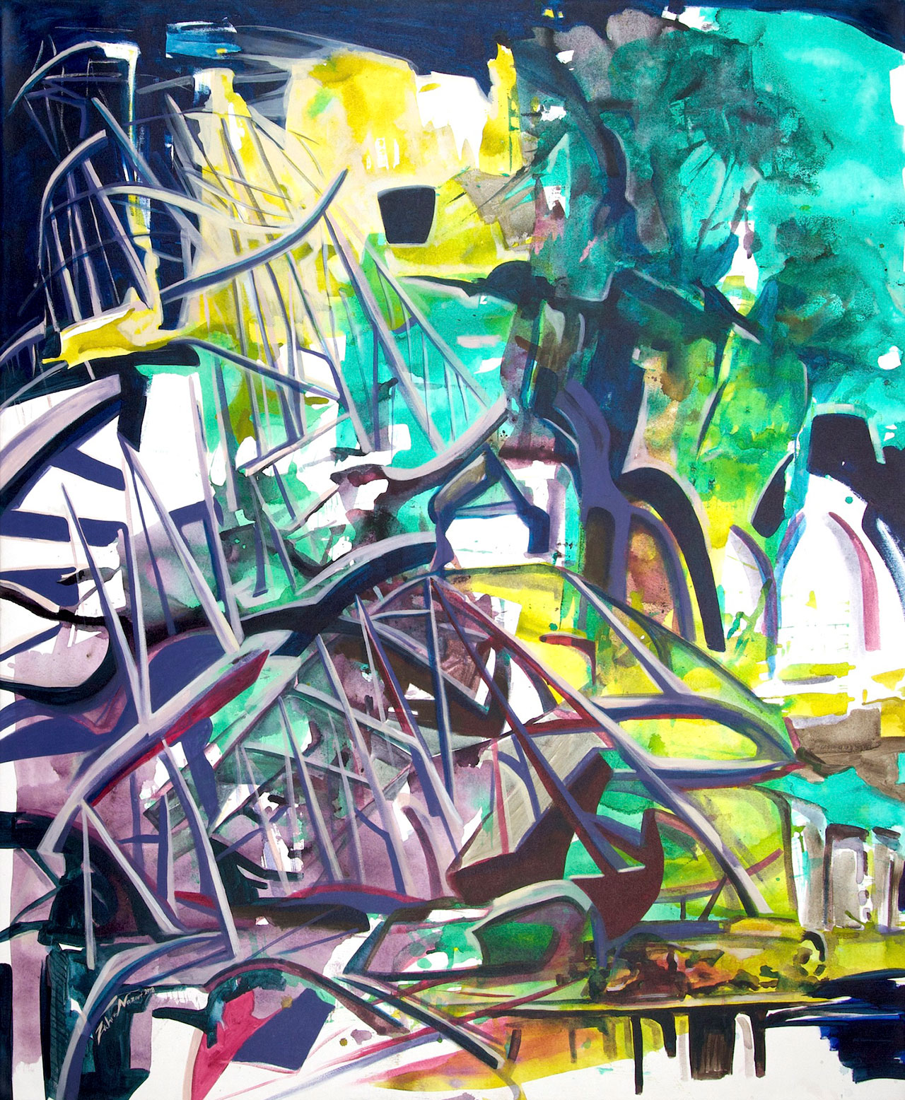 "Working from both photographs and memory, while allowing for improvisation and invention, Nazari rarely renders whole buildings in her paintings. Instead, she paints excerpts especially significant for her—a section of ceiling with its elaborate details, a particular sequence of windows or vaults, floral patterning, part of a wall—which she combines with abstract gestures and shapes, other forms resembling jumbled architectural fragments, and intermingling colors.Architecture is never static in these works, but instead unstable, changeable, often vertiginous, and under duress (the Ali Qapu Palace, incidentally, ravaged by environmental and political forces, was at one point a ransacked ruin). Construction and deconstruction share close quarters in Nazari’s work.