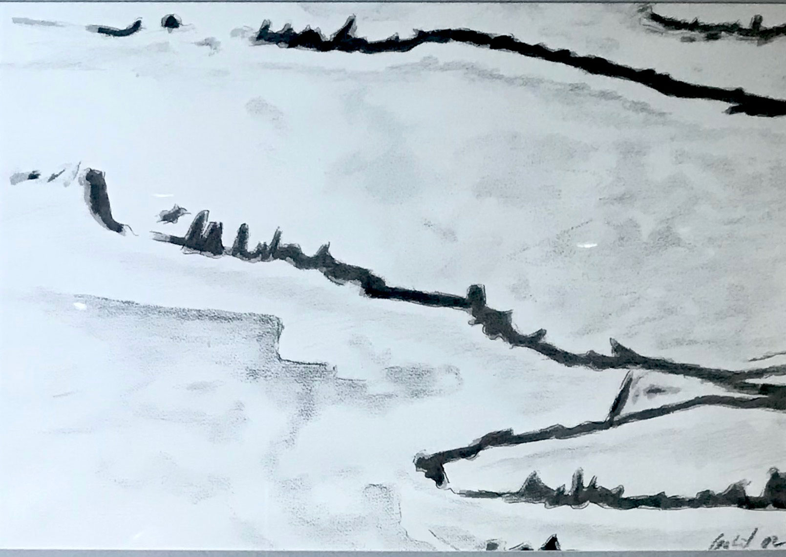 These drawings are my initial artistic reactions to my first deployment to the high Arctic, aboard Canada’s largest and strongest icebreaker Louis S. St-Laurent, as fall gave way to winter. I was privileged to witness the process and progress of congelation as the open portions transformed from water to ice, both from shipboard and from her helicopter. As sea water freezes, it goes through stages, each of which has a scientific name; young, salty, flexible ice from 4-10 cm (1.5- 4 in) thickness is called nilas. When older, rigid sea ice masses are driven together by wind or tide, the result is either rafting — one side clearly over the other— or ramparting where ice at the junction is fractured and pushed up into walls. Nilas, on the other hand, develops a lovely over-and-under pattern that could be thought of as weaving: finger rafting. The ‘some for me, some for you’ nature of the intersection has evident metaphorical implications, especially given that this zone, when frozen together, is twice as thick and strong as the original nilas sheets.