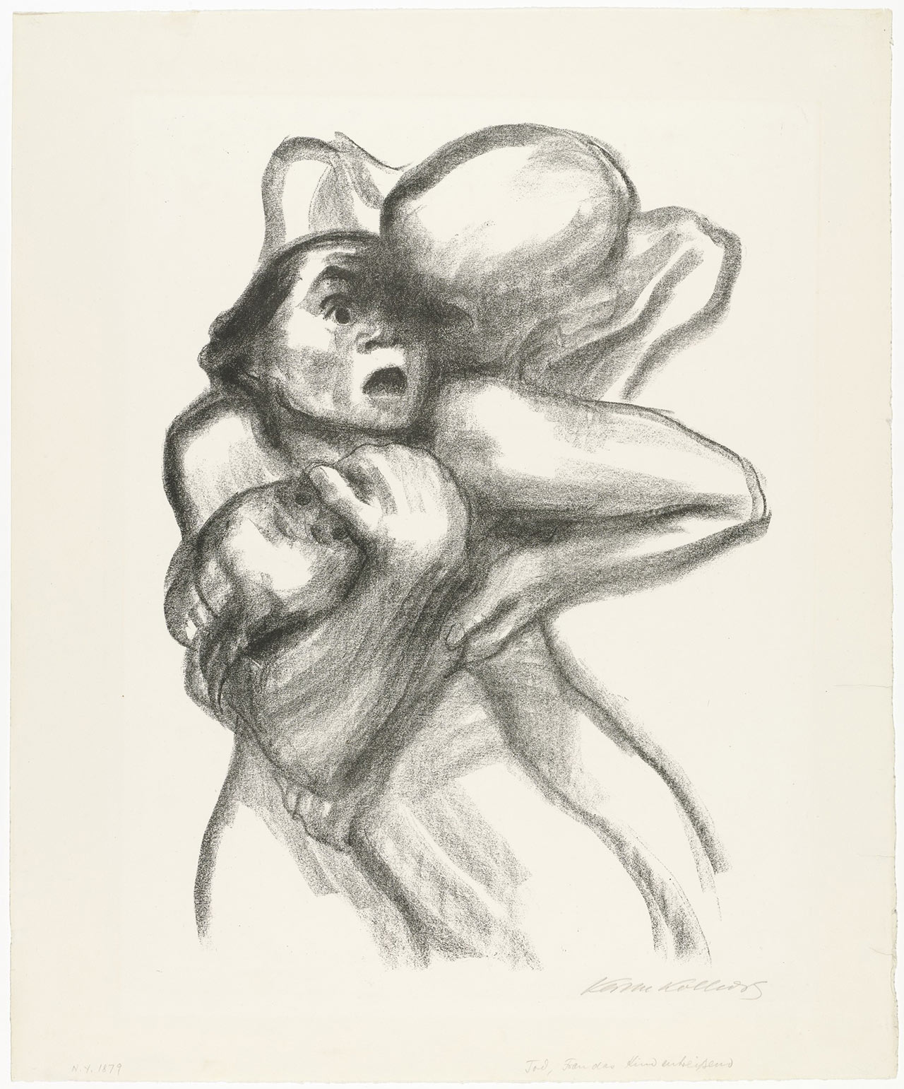 Kollwitz’s compassion for those in need has bestowed on her continued international renown. Today, her name evokes images of bereaved mothers, ailing, fatherless children, anguished parents, and, more generally, suffering and death. However, her reputation, while largely defined by its socially critical subject matter, also rests on her artistic talent and drive for experimentation in a wide range of mediums. Kollwitz often mixed various printing techniques to achieve a desired image. Even though the majority of her prints are black-and-white, a significant number of them reveal an interest in color that reflects her beginnings, when she was studying to be a painter.