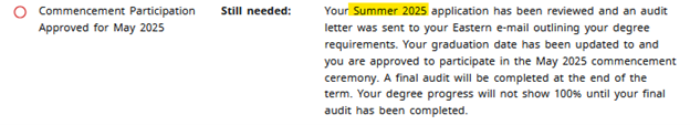 Student has received their initial audit letter and formally approved to participate in may ceremony.