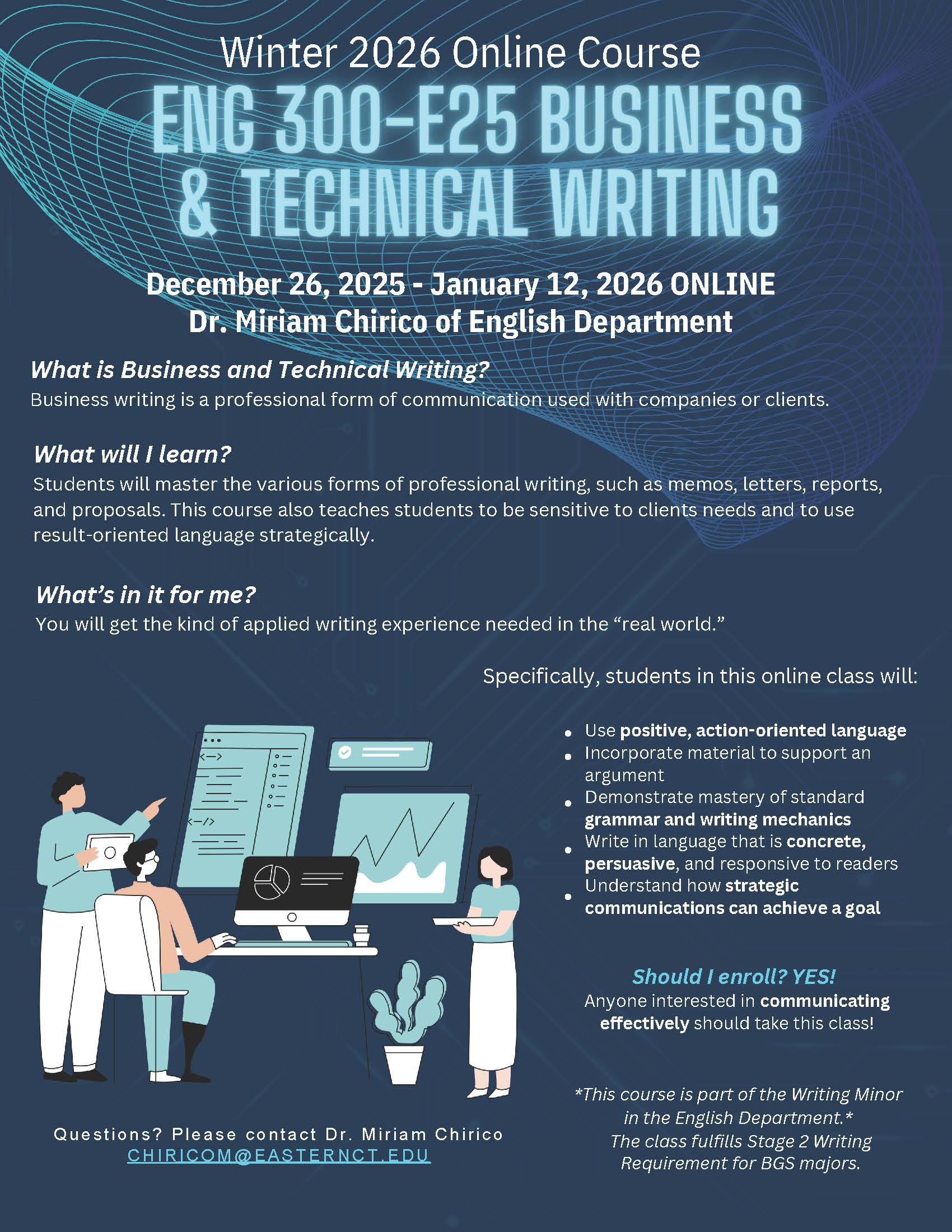 | UG | 20016 | ENG | 300 | E25 | 3 | Business/Technical Writing (Online) | TBA | 12/26-1/12/2026 | 15 | ONLINE | Chirico, M |